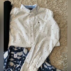 This includes two dress pants from iZod in Size 12 Husky. The black pair are more formal and the navy blue pair are a soft khaki style with nice stretch in the waist There are four button down dress shirts (1 from The GAP, 2 from Urban, and another from an Amazon brand), and a long sleeve button down dress shirt from Tommy Hilfiger. They all have very limited wear as they were only worn once or twice.