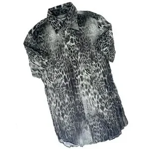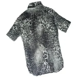 This sheer short sleeve shirt is from designer Tornado Mart in Japan. The pleated wrinkle sheer material is covered in a black and gray leopard print. Bought in Tokyo at Tornado Mart in 2001, this pre-owned shirt is in very good condition. 100% polyester, it is sized a Japanese medium which translates to a small in this country. Not worn much, it's a very cool and sexy shirt.