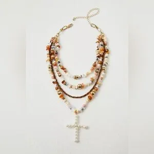 Layered to perfection, this beaded necklace celebrates maximalism with mixed-bead chains and a pearl cross pendant.