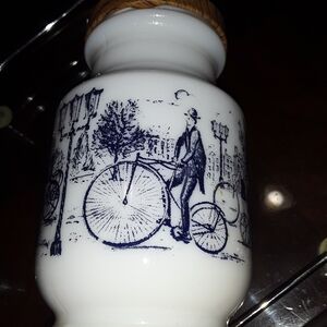 Vintage German Mustard Milk glass bottle/container with Victorian scene in blue.From the 1970s.Beautiful piece of Milk glass.
