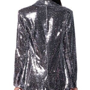 Tis the season for the sparkly fits! The Callie Holiday Sequin Fitted Blazer In Hematite is brought to you in a non-stretch lined mesh base fabrication with a sparkling layered sequin outer shell and features a notch lapel collar, lightly padded shoulders, long sleeves, a plunging neckline, princess seaming, mock front flap pockets, and a fitted silhouette. Complete with a light polyester inner lining and a slip-on fit with a single-breasted faux silver button front closure. Included for a fab finish, style with the Sequin Fitted Big Booty Short In Hematite.