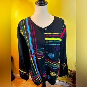 Black with colorful bric brac appliqué. 21” shoulders, 25” length, 52” bust, 25” arm.