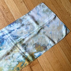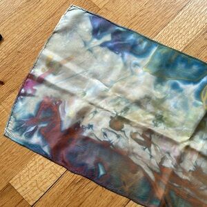 Silk scarf, tie-dye like patter gold, green, rust, blue, pink and off-white
