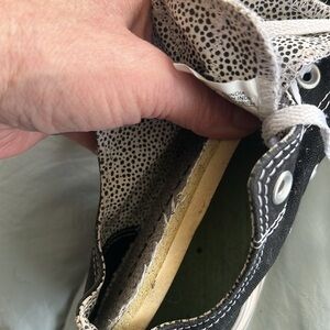 Black and white with polka dot double tongue design. Gently worn. In great condition. Thick memory foam insole for all day comfort. True to size.