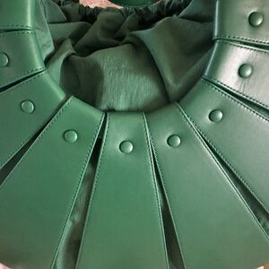 Beautiful soft leather in such a beautiful green. The color is rich and saturated but still bright sophisticated. The bag is HUGE! Can work as an overnight bag or a bag to bring to the office with a change of clothes in.