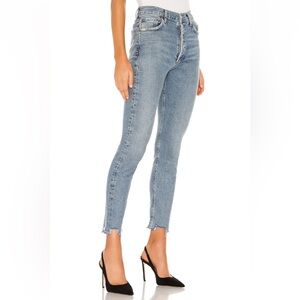 AGOLDE Nico High Rise Slim Jean in Rooted. Raw hem. Button front closure.