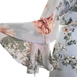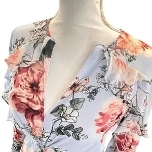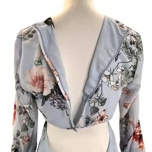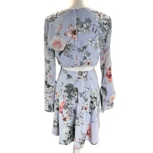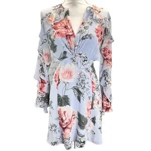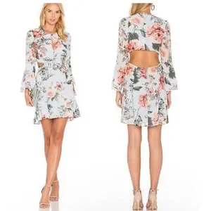 Bardot Revolve Mini Dress Blue Size 6 Floral Frill Bell Sleeves Ruffles Cut Out Side Zipper Long Sleeves Chiffon V-Neck Party Cocktail Boho Bohemian Summer