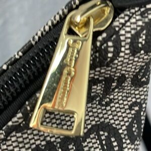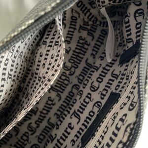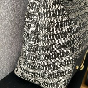 JUICY COUTURE OFF THE CHAIN COHO convertible purse black beige color, grey faux leather with black Juicy Couture script, magnet snap closure back pocket, black faux leather carrying handle, black faux leather shoulder crossbody strap,Interior zip pocket, interior slip pockets, gold tone hardware