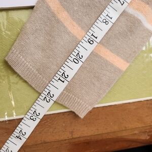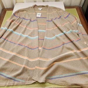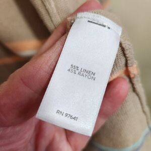 linen rayon open cardigan. smoke and odor free. tan with pastel stripes. casual weekend or office attire.