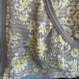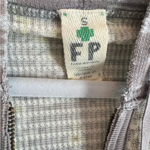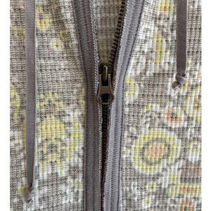 Free People Waffle Thermal Zip Front Hoodie in gray/yellow floral print motif with 3/4 length sleeves, front pockets, contrasting color wrists and hood. Fitted with longer torso, flat in the front with stretchy waistband in the back. Distressed detailing throughout. Excellent pre-loved condition.