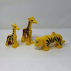 The smaller giraffe, hippo and tiger are marked Duplo. They are vintage pieces.