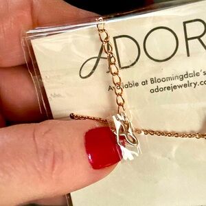 NWT NEVER worn, or removed from original packaging adjustable Adore bracelet in rose gold with a Swarovski crystal is a must have for any jewelry lover. There is single crystal in the beautifully crafted asymmetrical shape, and “A” charm on the end of the extender chain adding charm to this piece.
