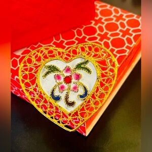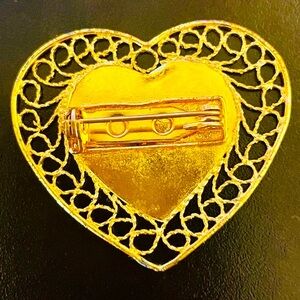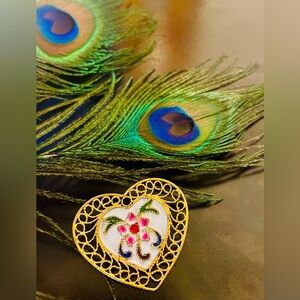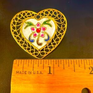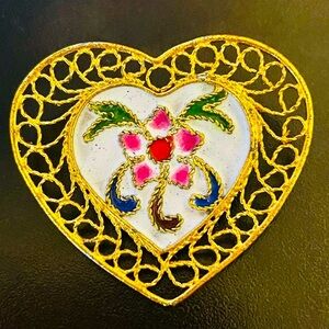 Vintage Gold Filigree and Enamel Floral Brooch. RARE FIND! Pre-owned. Gold tone filigree design surrounds this heart brooch. At the center of the heart is an enamel floral design with white, pink, red, green, blue and black. Brooch clasp on back is in good functioning order. Note: this is a vintage piece so it has been preowned and loved. There is a very slight dimple on the back top right of the heart. I don’t know if this was done when making the brooch or from wear. Approximate dimensions: 1 1/2inch long x 1 1/2 inch wide.