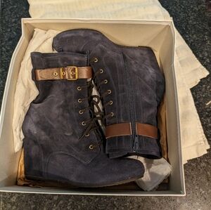 This is a beautiful Navy suede wedge boot in a size 9 or size 40 European size. with a leather buckle around the ankle never been worn. only tried on. They have a 4-in heel and a rubber non slip sole.