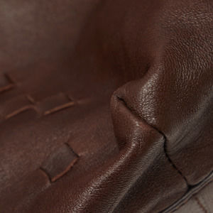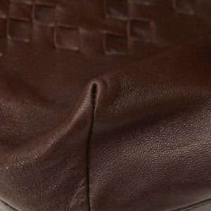 This shoulder bag features a woven leather body, a flat shoulder strap, a top zip closure, and an interior zip pocket.