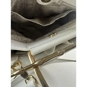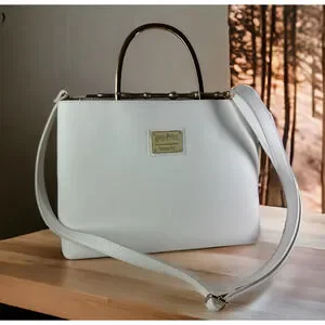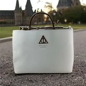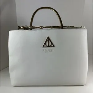 Cast a fashion spell with this white handbag from Loungefly and Harry Potter! This white faux-leather bag features golden hardware - including the golden handle that features the Elder Wand! The interior has an allover spell print with two separate compartments and drop and zip handles. Also includes a removable adjustable shoulder strap for magical style switch-ups.