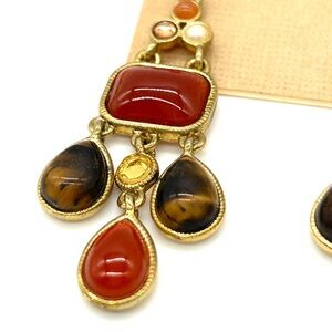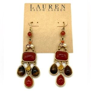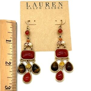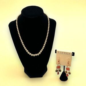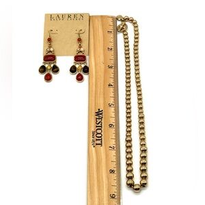 For your consideration is a Ralph Lauren bundle including new earrings and a beaded necklace! The earrings are dangle style with faux jewels in warm tones. They are new. The necklace has graduated gold beads, the largest is 6mm. The necklace does show slight patina but is overall in good condition. If you look close you will see it but from afar it's not noticeable if that makes sense! It measures 17" and has a toggle clasp.