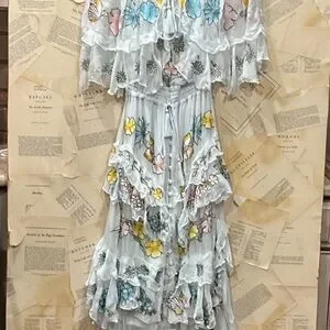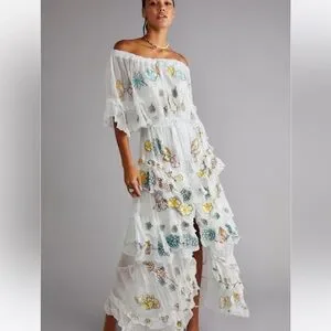 Free People Fillyboo Sweet Pea Tambourine Maxi Dress Off The Shoulder Gray Blue Gold Pink