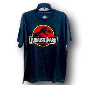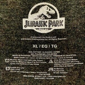 Graphic T-Shirt. Jurassic Park design. From the popular 90s classic movie & franchise, "Jurassic Park" starring Jeff Goldblum, Laura Dern, Sam Neill, Richard Attenborough, Ariana Richards, & more. Size Extra Large XL (Unisex). Universal City Studios brand. Dark Gray colored shirt with red, black, yellow, & white colors design . 55% cotton, 45% polyester. Brand new with tags attached. Perfect for any fan of the classic 90s movie!