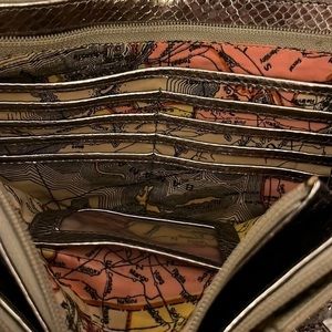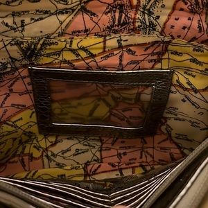 Beautiful pewter colored metallic leather crossbody. One scratch on flap of left front pocket. PLEASE SEE PICTURES FOR DETAILS! Approximate measurements are: 9-1/2” wide, 7” tall with an adjustable strap drop of 21”.