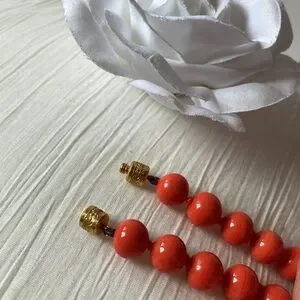 Excellent condition Vintage hand tied bead necklace. Gorgeous Orange-coral color. Vintage screw clasp in great working condition. Can also be worn as a multi wrap bracelet! Full length is 26 in.