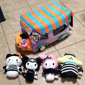 New with tags Kidrobot x Sanrio Hello Kitty & Friends Halloween Car Plush Set. Car measures about 13 x 9 x 8 inches, plush measure about 7 inches each.