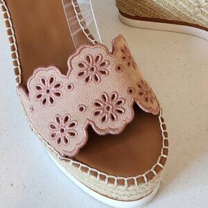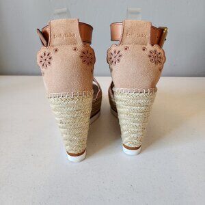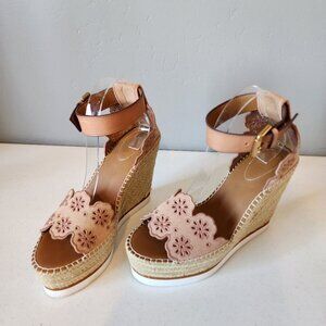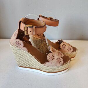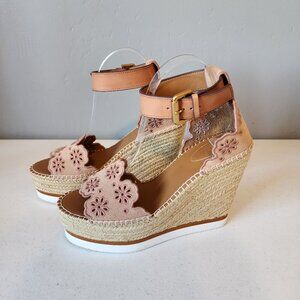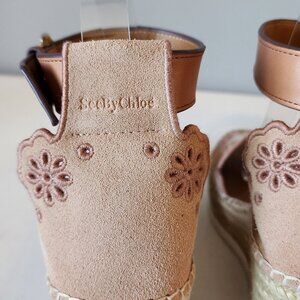 "EUC" Amazing Light Weight Wedge From See By Chloe. Leather/Suede Uppers with Scalloped Edges & Cut Out Flower Accents, Adjustable Ankle Strap, Cushioned Foot Bed & Almond Toe, Rafi Wrapped 2" Platform & 4.3/4" Wedge Heel, White Rubber Soles, Tan & Rose in Color, Great Condition, No Wearing on Uppers, Minor Markings on Soles, Worn Once:) Rt.325.00 approx. Size 40/9, Foot Bed Measures 10" for Reference. *Perfect Spring/Summer Shoe!