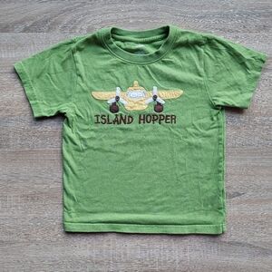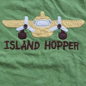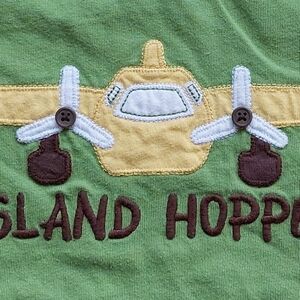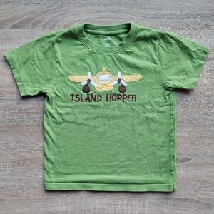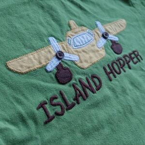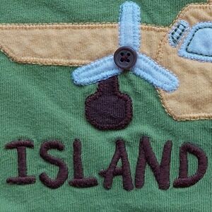 This listing is for 2011 5t Gymboree plane tee. I believe it was from some toddler boy Island line. I always loved OG Gymboree because.I am a dork & the detailing & quality. Here the propellers are comprised of brown buttons which makes it more interactive. This tee is in very good used condition with minor fuzzing. It was probably worn 1-2x by my eldest. Popular probably due to the fact it was a plane & this was the largest size available. Gymboree sizing is much different now. I had fun photographing. The perception of the green varies based on the lighting. It would be fun to learn about photography. I dont know anything & just wing it (corny joke).