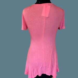 Features an extended long sharkbite hemline offering extra coverage, with a rounded neckline.