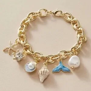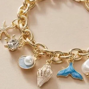 Beautiful gold toned charm bracelet with dangle starfish, blue enamel whale tail, simulated diamond, faux pearl in a clam shell, seashell and faux pearl. This bracelet embodies the summertime and is the perfect accessory for any outfit.