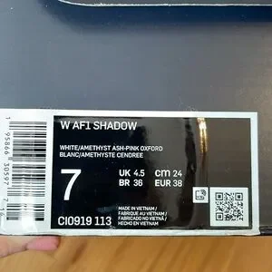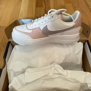 Never worn, still in the box (box has some damage). Pink, purple swoosh. Air Force 1 low shadow rare colors
