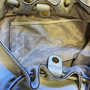 Soft creamy leather hobo style shoulder bag. Cinches up when carried. It is in good used condition. Some fain scuffs on the leather which may come off with the right cleaner. Inside lining is in good condition, with just a small mark on the bottom.