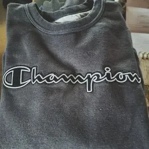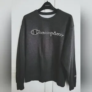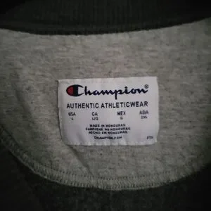Champion Sweatshirt is a gray pullover made of cotton. It has a crew neck, long sleeves, and a solid pattern. The sweatshirt is lightweight and suitable for all seasons. It is machine washable and has the Champion logo as an accent. The athletic fit makes it perfect for gym and training, walking, cross-training, and running & jogging. It is available in size Large and is manufactured in Honduras.