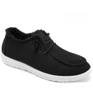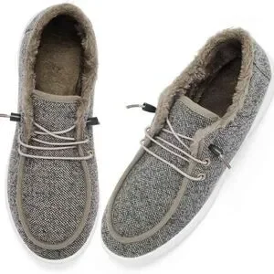 Trendy and comfortable Tweed Wallabee-style pull-on loafers with cozy faux fur lining and footbed. Flexible non-marking, non-slip outsole. Adjustable bungee cord lacing.