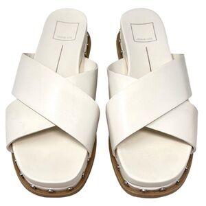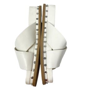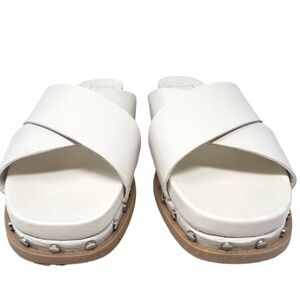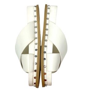 Particulars: Perfect summer sandal! These shoes feature: white criss cross vamp, metal silver stud detailing on the platform over croc-style embossing, padded and cradled footbed, and non-slip sole. Great with all your warm weather looks including by the pool!