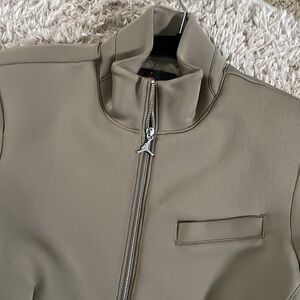 The jacket is designed with a high collar, front zipper closure, and two large front pockets for practicality and style. The contrast panels on the sides add a modern touch to this classic piece, making it perfect for both casual and semi-formal occasions.