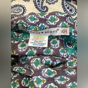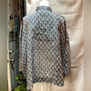 This lightweight Gretchen Scott blouse was made in India and provides for an Indian vibe. It is made from 100% cotton and can be worn in various ways. It is approximately 28” long and the bust measures approximately 30” pit to pit.