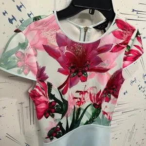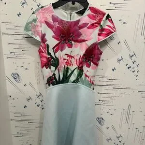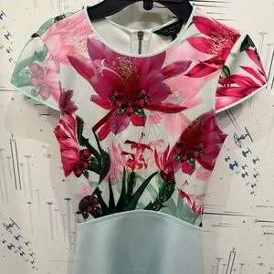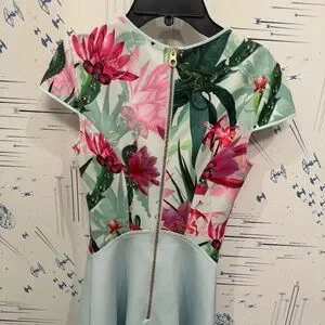 It has a cap sleeve and gold exposed zipper down the back. The top features colorful green and hot pink floral patterns, while the skirt is a soft, Tiffany blue.