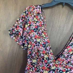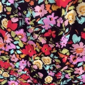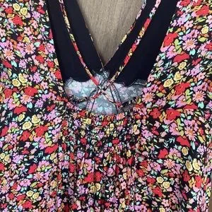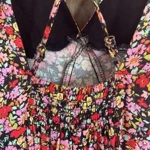 Tag words: black background - neutral color with colorful floral print including pink , red , yellow , green , a orange and blue green , smock smocked detail cris cross straps form a cut out cutout like detail , casual , office , party , beach , back to school , boho , bohemian , retro bottom is more flowy than the top