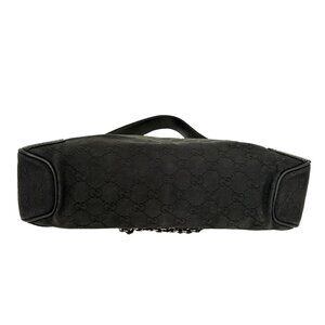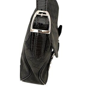 Gucci vintage bag by Tom Ford. Black monogram canvas with black leather trims. One flat handle. Silver-tone hardware. Horse-bite and chain at front. Magnetic snap closure at flap. One interior zipper pocket.