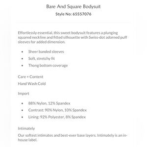 Effortlessly essential, this sweet bodysuit features a plunging squared neckline and fitted silhouette with Swiss-dot adorned puff sleeves.