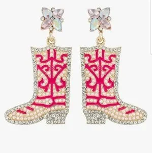 Rose Pink Gold Cowgirl Boots Western Earrings Pearls & Rhinestone Rodeo