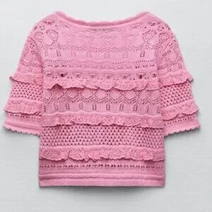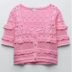 NEW ZARA Pink Cotton Knit Crochet Crop Top: Cottagecore Cardigan