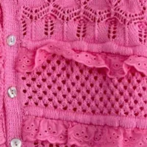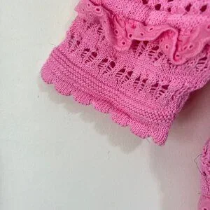 Zara Pink Pointelle Knit Crochet Crop Top, a blend of charm and comfort. Made from cotton, with a deep scoope neckline, short sleeves, and front button closure with beautiful mother of pearl buttons. With its pointelle knit cardigan design and delicate pink ruffle knit embroidery, it has cottage core charm. The scoope neck crop top silhouette adds a touch of whimsy, making it perfect for pairing with your favorite bottoms or layering over dresses. Embrace the nostalgic allure of cottage core fashion with this enchanting addition to your wardrobe