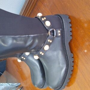 Questions? Leave a comment below!New with box. Size 7.5. Leather upper, faux pearl and gold beads embellishments on the ankle. Neoprene on the back calf.