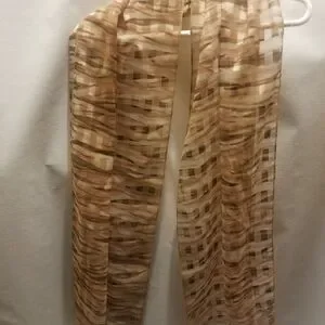 Gorgeous sheer scarf with earthtone wavy stripes and shimmering rows of gold rectangles. Lost its tag, otherwise great condition!
