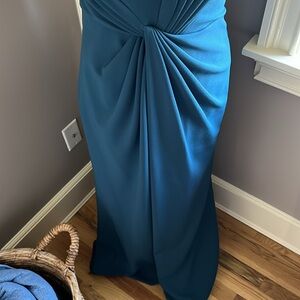 Elegantly draped panels are gathered and knotted at the waist floor pooling skirt.