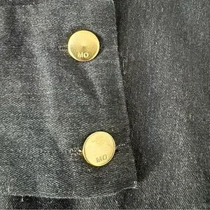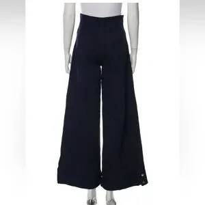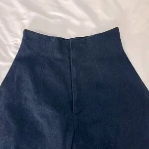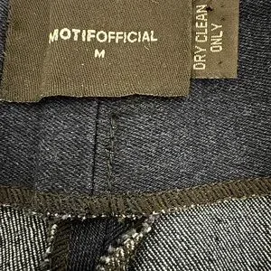 Motif Official High Waisted Dark Wash Wide Leg Jeans, Medium. Super flattering and stylish jeans with high waist. Jeans have some stretch, and front zip and button closure cinches you in at the waistline. Decorative buttons at cuff. Love these jeans! The fabric tag has been removed, but they feel like a cotton blend with spandex/elastane for stretch.