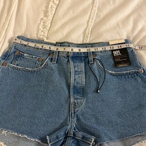 NWT Levi’s 501 denim shorts with raw hem. Size 30. Measurements in pics.