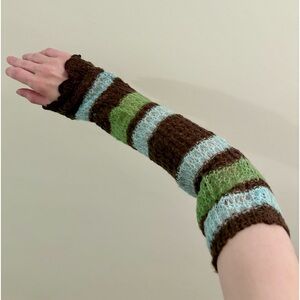 Loose knit arm sleeves with stripes of blue, green, and chocolate brown. Length hits above the elbow. Never worn other than try on.